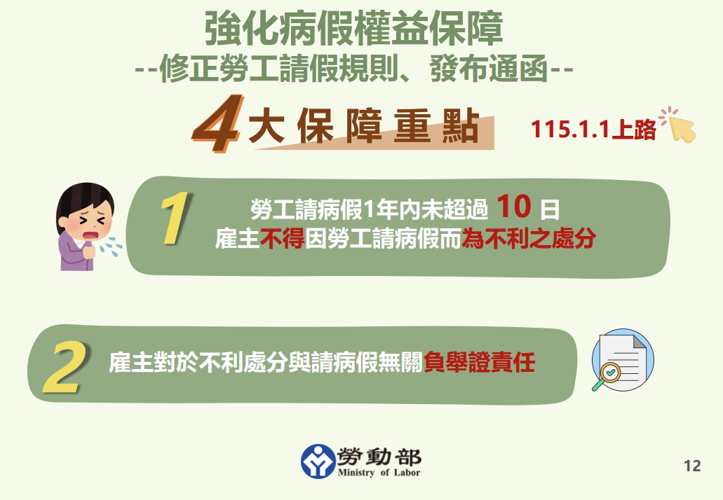 1. 明定勞工請病假未超過10日,雇主不得為不利之處分。