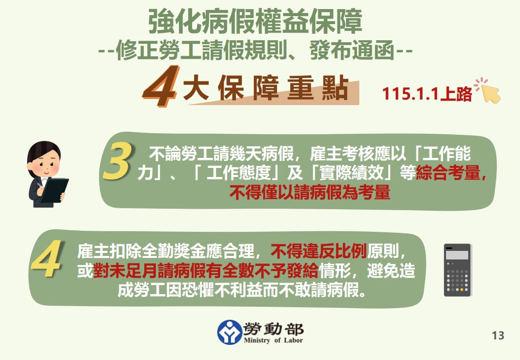 勞動部提醒,以上勞工請假規則修正,雇主若違反,將依《勞動基準法》處以新台幣2-100萬元。