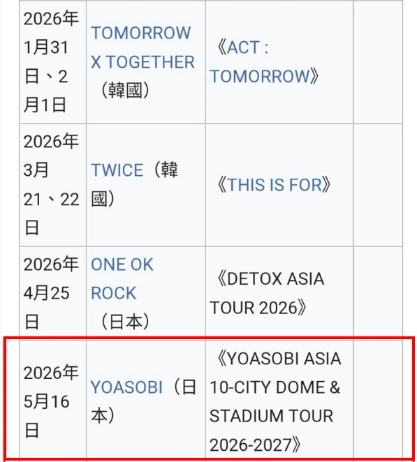 此消息間接證實維基百科寫2026年5月16日,YOASOBI在臺北大巨蛋開唱的訊息是錯誤的。