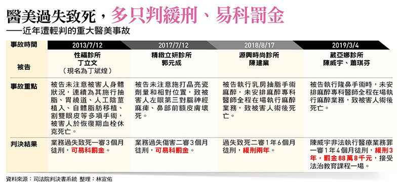 根據司法判決書資訊,一三年,他就曾在診所連續為患者施行抽脂、胃繞道、人工陰莖植入、自體脂肪移植等多項手術,患者三天後死亡。但當時他與家屬和解,法官考量犯後態度良好,僅依業務過失致死判處有期徒刑三個月,可易科罰金九萬元。