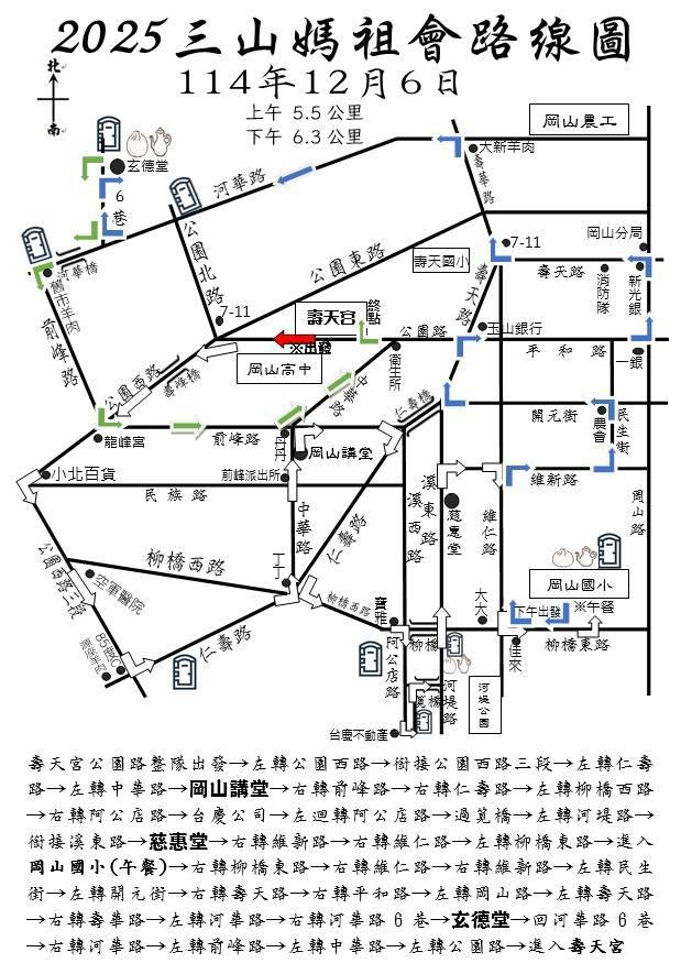 12/6(六)白沙屯媽祖與高雄三山媽祖,於上午8時30分從壽天宮公園路起程,行經岡山講堂、主委住宅、慈惠堂。中午在岡山國小停駕。午休後起駕行經玄德堂、龍峰宮、岡山高中。下午6時返回並夜駐駕壽天宮,全程共11.8公里。