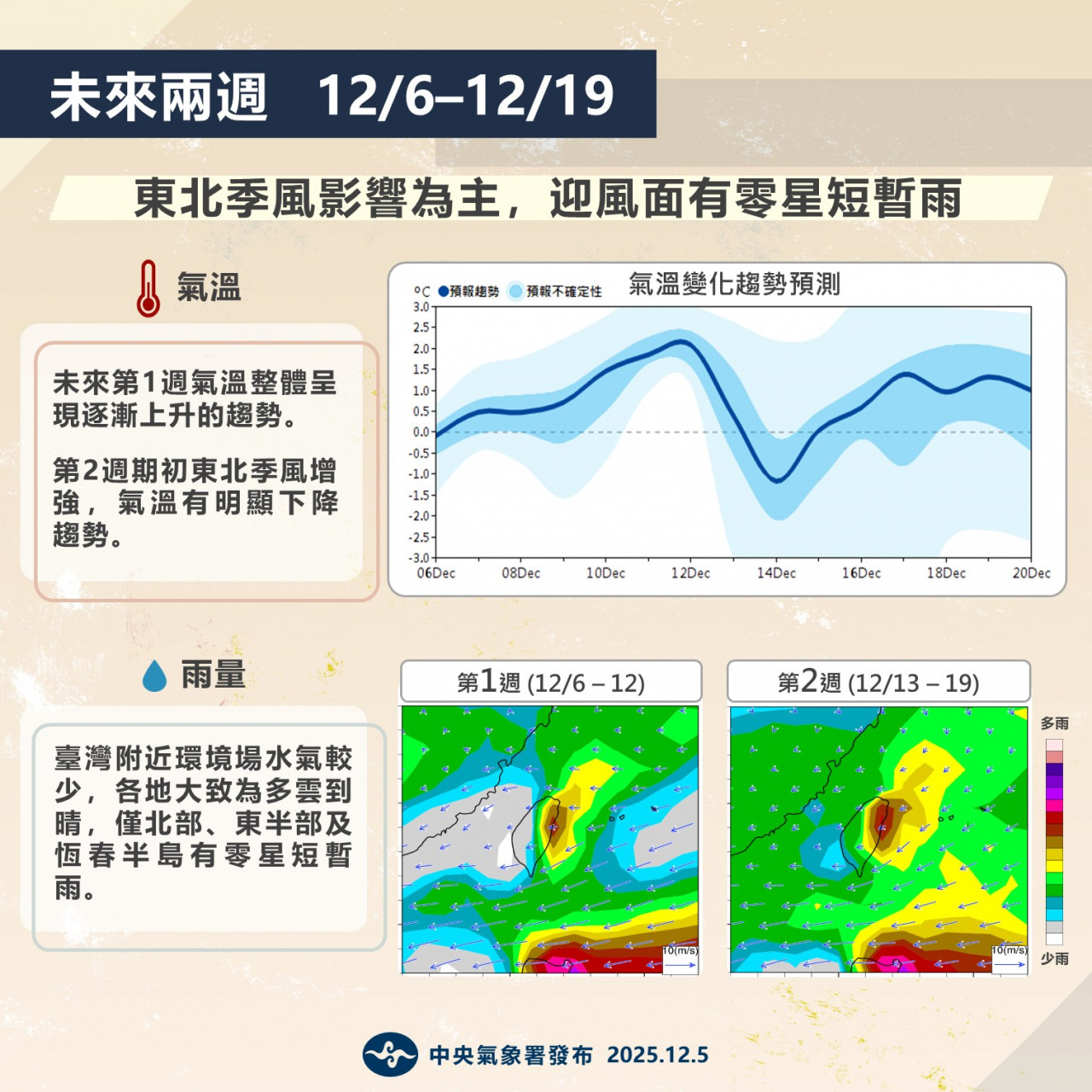 本週前後會有2波冷空氣南下! 12/8及12/9日,受第1波東北季風增強且南下影響,環境水氣增多,宜蘭、大台北山區及基隆北海岸有大雨發生機會;北部及東北部地區降溫最為顯著,中南部地區日夜溫差仍大。12/10至12/13日,受東北季風減弱影...