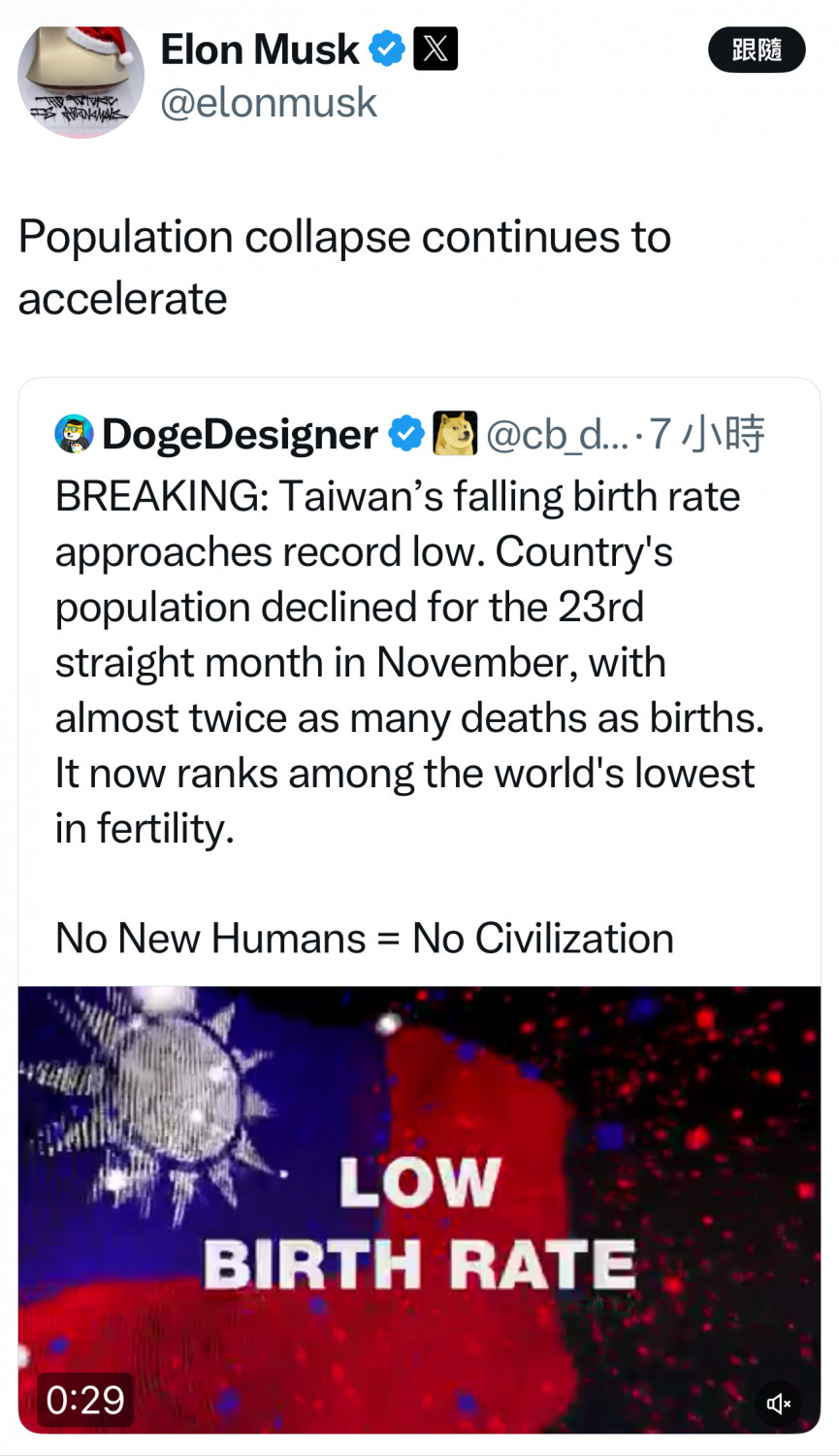 他轉發的文章是由帳號「DogeDesigner」發布的貼文,內容正是提到:「台灣出生率持續走低,接近歷史最低, 11月台灣人口連續第23個月下降,死亡人數幾乎是出生人數的兩倍,目前,台灣的生育率位居世界最低之列」。