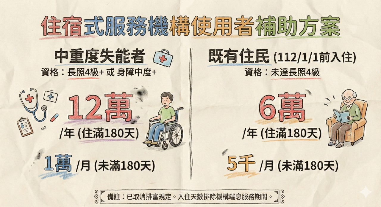 ▲「住宿式服務機構使用者補助方案」主要補助條件和金額。(圖表由Nano Banana Pro生成)