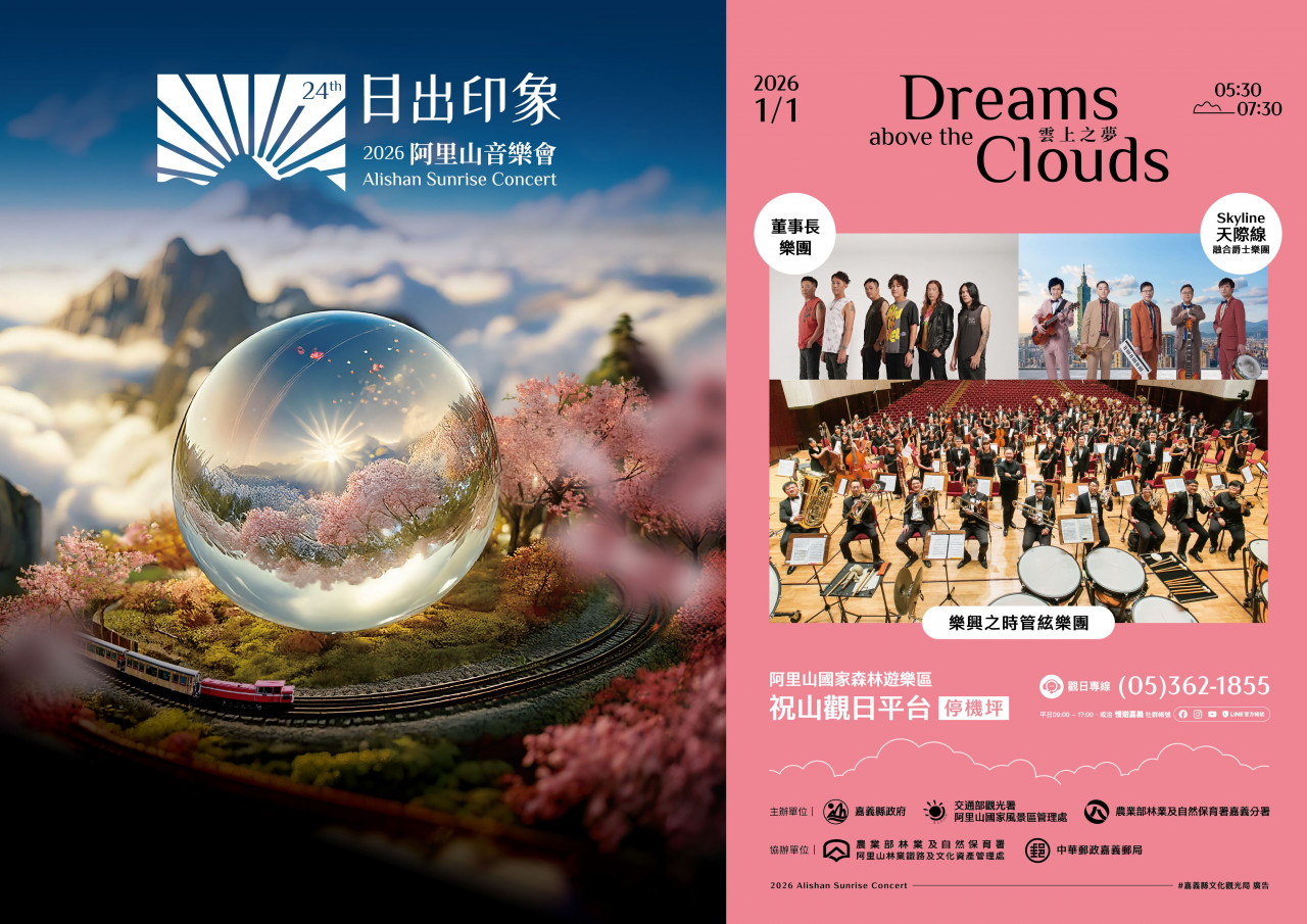 歲末迎新之際,阿里山林業鐵路特別加開元旦「祝山線觀日列車」,載旅客到全台海拔最高的祝山車站,前往日出聖地;阿里山賓館推出「曙光日出專案」,內含祝山線來回火車票;2026日出印象音樂會也一定要參加,民眾可在清晨7時05分,伴隨現場演奏,欣賞玉山群峰透出第一道晨光,為2026年揭開序幕。