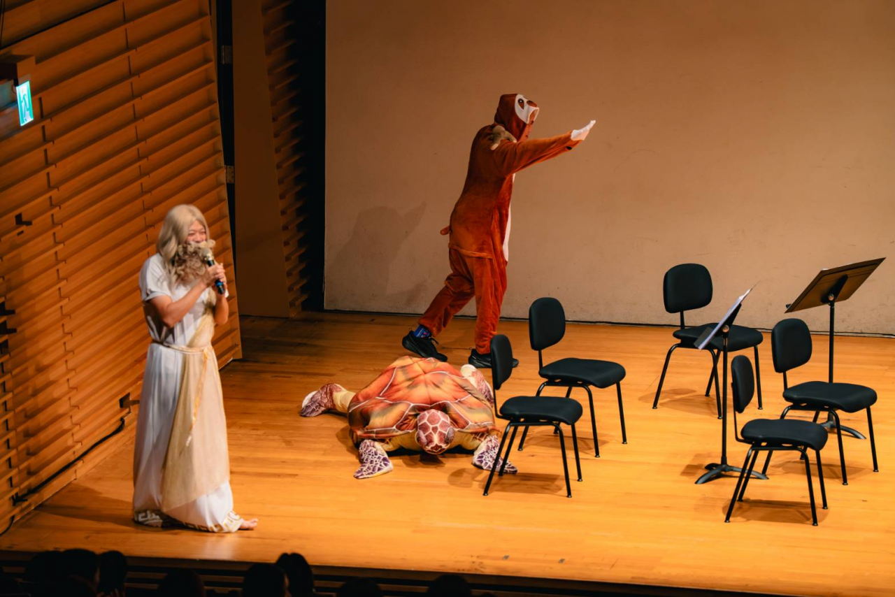 ▲兩位音樂家以樹獺及海龜妝扮爬進音樂廳,掀起場中大人小孩一片歡呼聲。(照片來源:灣聲提供)