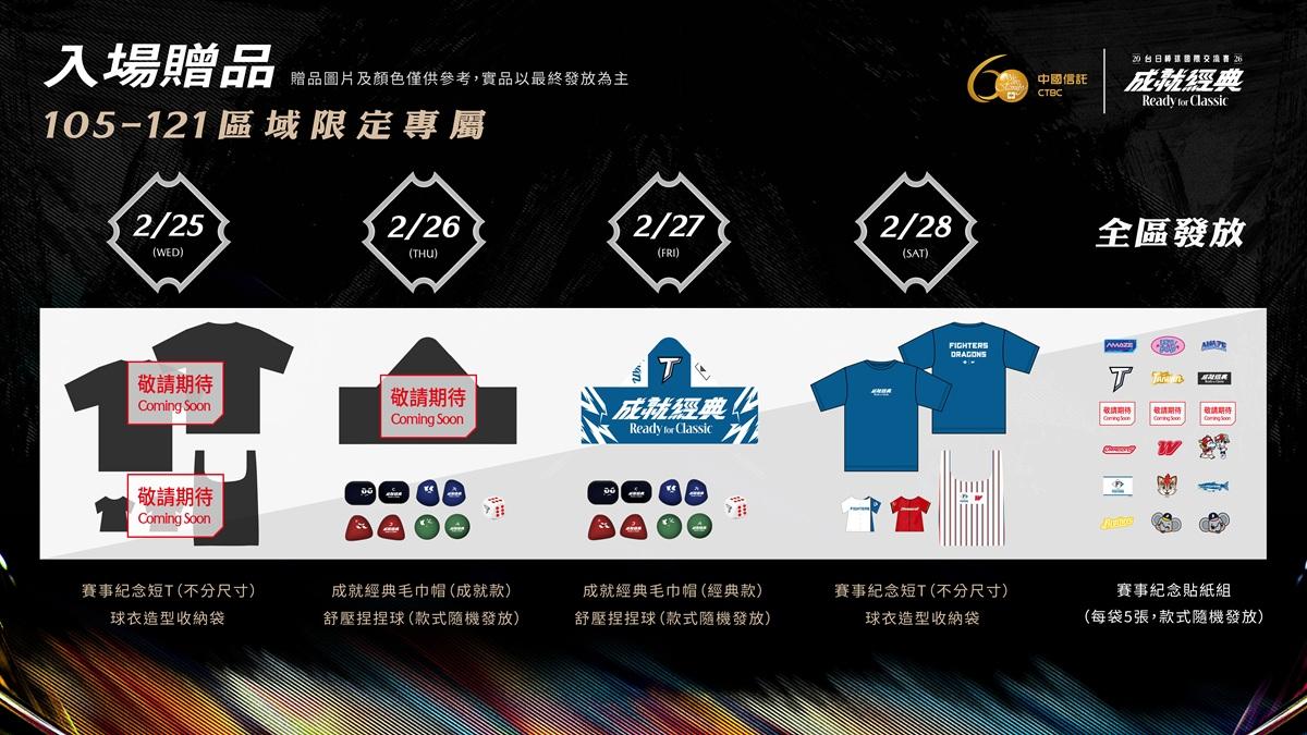 於2/25~2/28台日棒球國際交流賽舉行期間入場看球,凡座位區位於105~121區域的球迷,可獲得相關入場贈品: