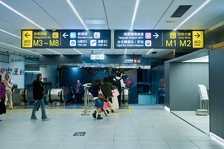 旅客服務區塊,同樣也在改造中煥然一新。北捷延續中山站的服務盒模組概念,讓各項設施配置更自明,資訊看板、服務台、商業空間等彼此間不再互相干擾,以更直覺方式呈現,因過去旅客最常遇到的困擾就是「資訊太多,反而難找到方向」,北捷重新整合指標系統,將過量的公告資訊收斂為精準易讀的視覺語彙,讓旅客在大廳中抬頭就能找到方向,不再需要停下腳步比對多重告示。