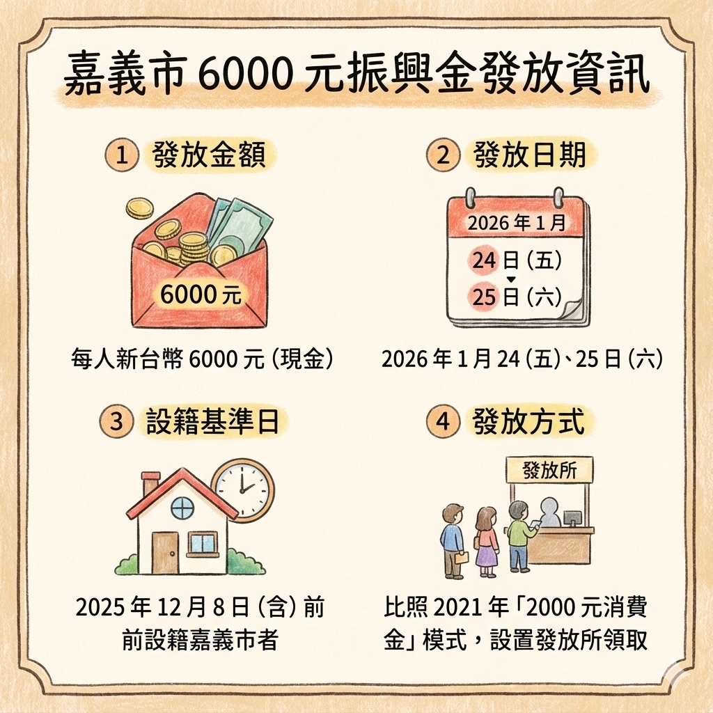 ▲嘉義市民普發6000元現金明年1月入帳。(圖表由責編整理,Nano Banana Pro生成)