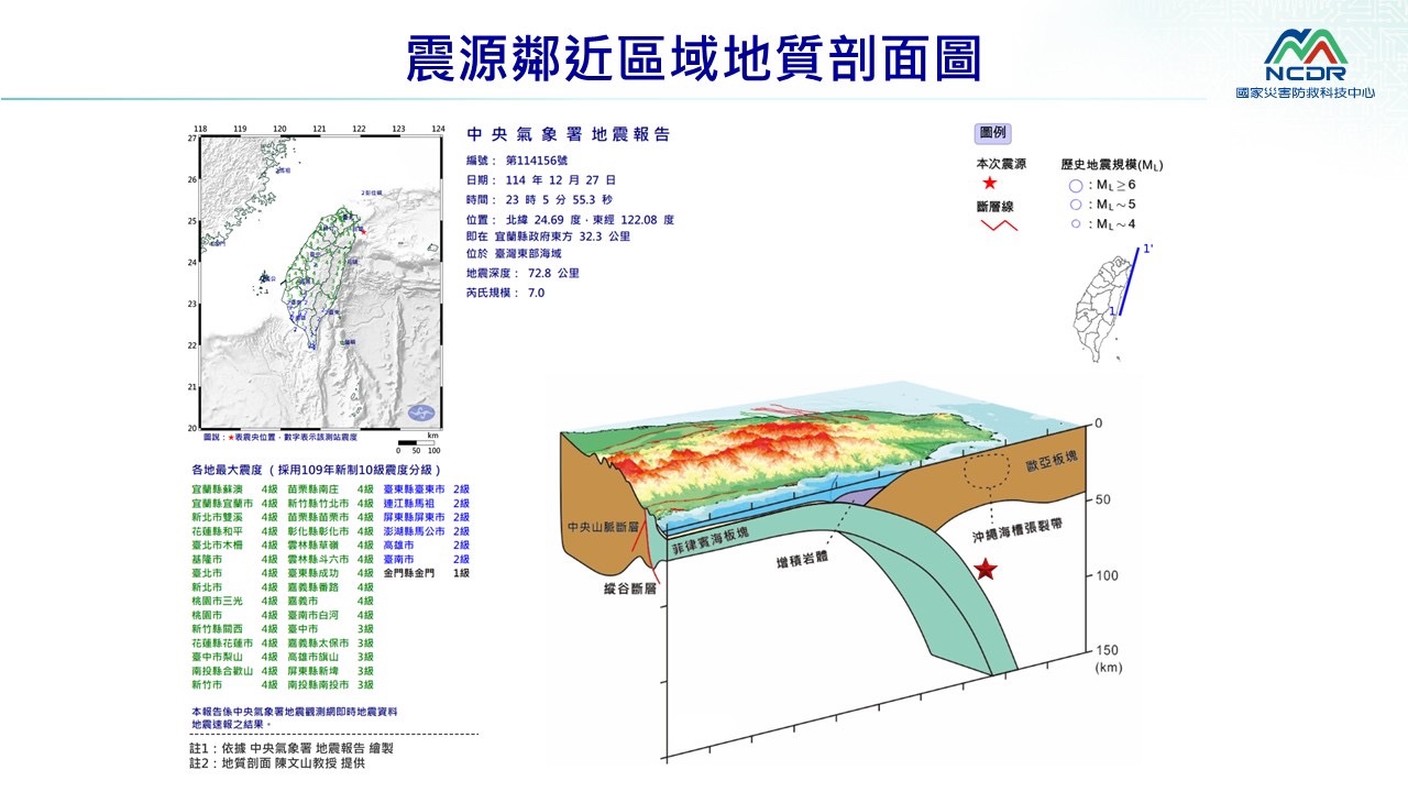 12月27日深夜11時5分發生芮氏規模7.0地震,震央位於宜蘭縣政府東方 32.3 公里,地震深度72.8公里,為今年首起規模7地震,也是繼921大地震、花蓮0403地震後,規模最大的地震。