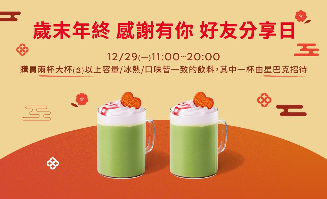 星巴克買一送一活動又來了,根據星巴克官網,在12/29(星期一)推出「歲末年終 感謝有你 好友分享日」活動,於活動期間11時至20時,至門市購買兩杯大杯(含)以上容量/冰熱/口味皆一致的指定飲料,其中一杯由星巴克招待。