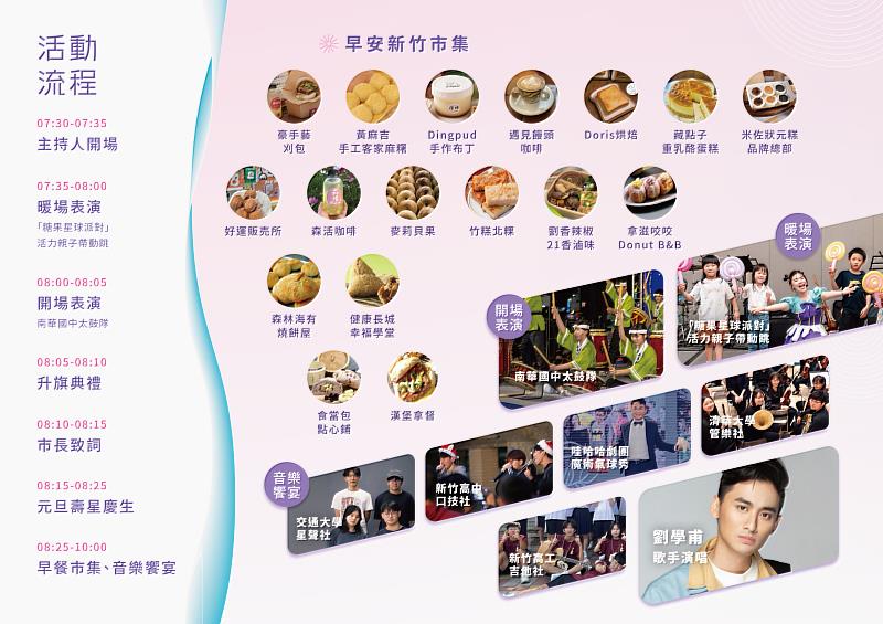 2026元旦上午6時30分,新竹市府前廣場舉辦「竹風揚旗迎新年」元旦升旗典禮,竹市府規劃一系列迎新活動,包含元旦限定「早安市集」,以及「音樂饗宴」、「客家花布春聯手寫DIY」、「元旦客製化杯套絹印DIY」、「元旦壽星慶生活動」與「吉祥物活力集點卡—三寶開新年」互動闖關等。