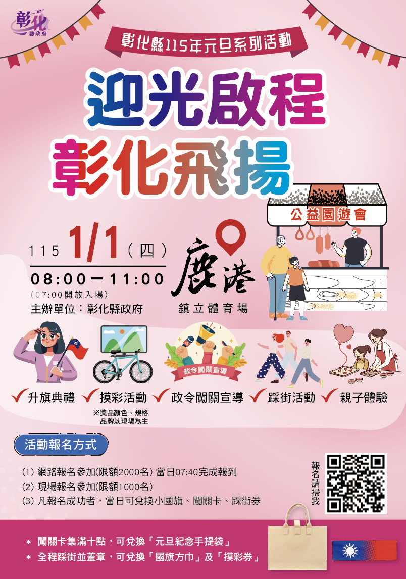 彰化鹿港鎮立體育場舉辦「迎光啟程.彰化飛揚」元旦系列活動,內容包括元旦升旗典禮、公益園遊會、政令闖關宣導、踩街活動、親子手作體驗及摸彩等。