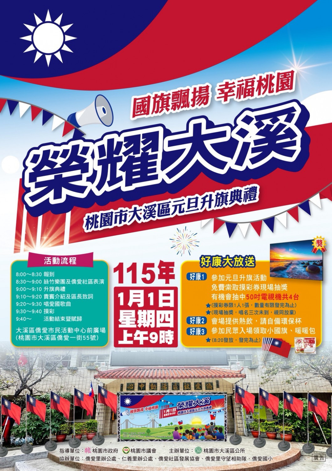 大溪區元旦升旗典禮上午9時開始,當天提供熱飲,現場發送限量小國旗、暖暖包,還能免費索取摸彩券,有機會抽中50吋電視機(4台),摸彩券一人一張,發完為止。