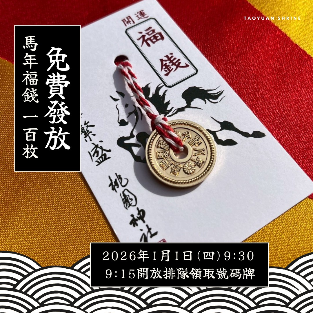 桃園神社推出丙午馬年紀念福錢,元旦當天上午9時15分開放排隊領取號碼牌、9時30分開始發放,限量100枚,送完為止。10時30分初詣限定福袋開賣,限量50份,每人限購1份。上午11時及下午2時還有初詣限定御朱印受付,費用350元,限量200張,每人限購1張。