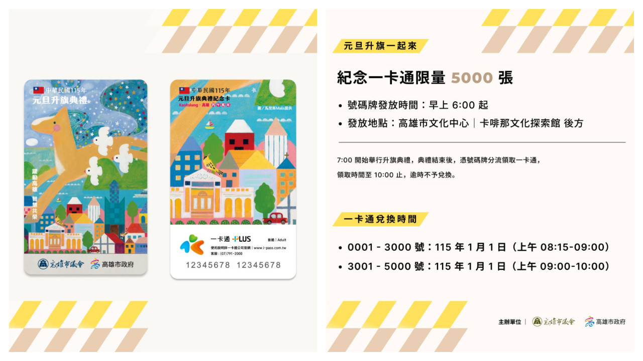 高雄文化中心元旦舉行升旗典禮,並限量發放5000張「馬年紀念一卡通」,特製版一卡通以丙午馬年與「躍動高雄,智慧共榮」為主題設計,一匹彩繪馬伴隨代表希望的小鳥,飛越過高雄的著名地標,象徵帶來智慧與多彩的未來。
