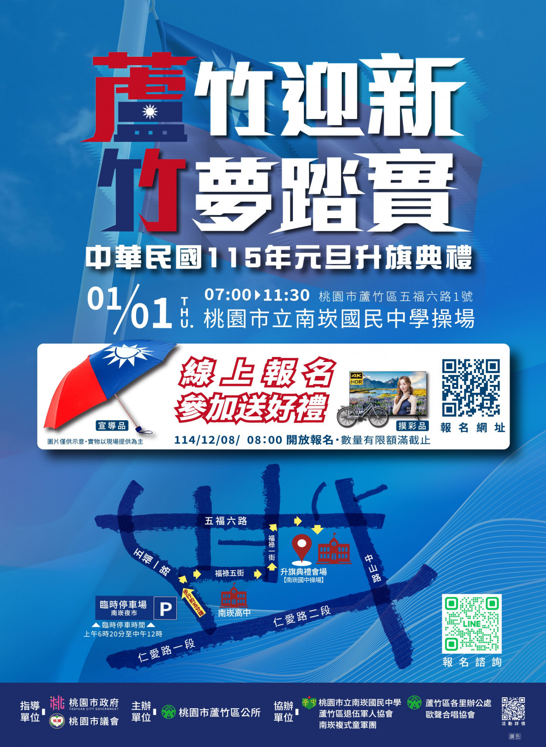 「蘆竹迎新 竹夢踏實」元旦升旗典禮,在南崁國中操場舉行,活動時間為上午7時至11時30分。預先報名即可獲得宣導品、市集消費兌換券與摸彩券。