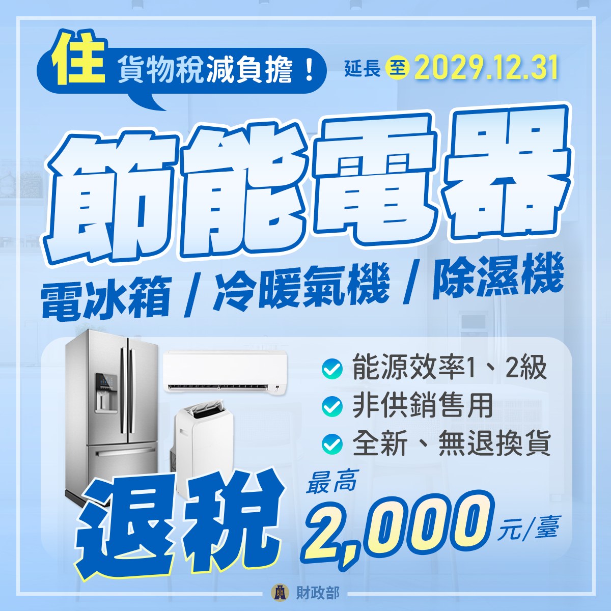 國稅局表示,為達節能減碳目標及鼓勵民眾購買節能電器,凡購買能源效率第1級或第2級之新電冰箱、新冷暖氣機或新除濕機,可於購買日之次日起6個月內,以網路或書面方式向任一國稅局申請退還減徵貨物稅,每臺最高減徵貨物稅新臺幣2,000元,適用期間至118年12月31日止。