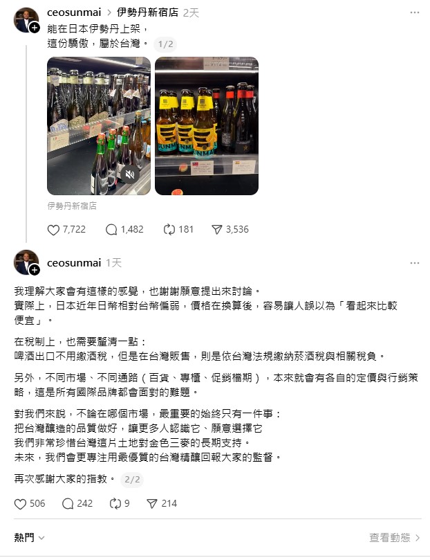 面對網友質疑,葉冠廷也親上火線回應,「實際上,日本近年日幣相對台幣偏弱,價格在換算後,容易讓人誤以為『看起來比較便宜』。在稅制上,也需要釐清一點: 啤酒出口不用繳酒稅,但是在台灣販售,則是依台灣法規繳納菸酒稅與相關稅負。」不同市場、不同通路皆有各自的定價與行銷策略,這是所有國際品牌都會面對的難題。