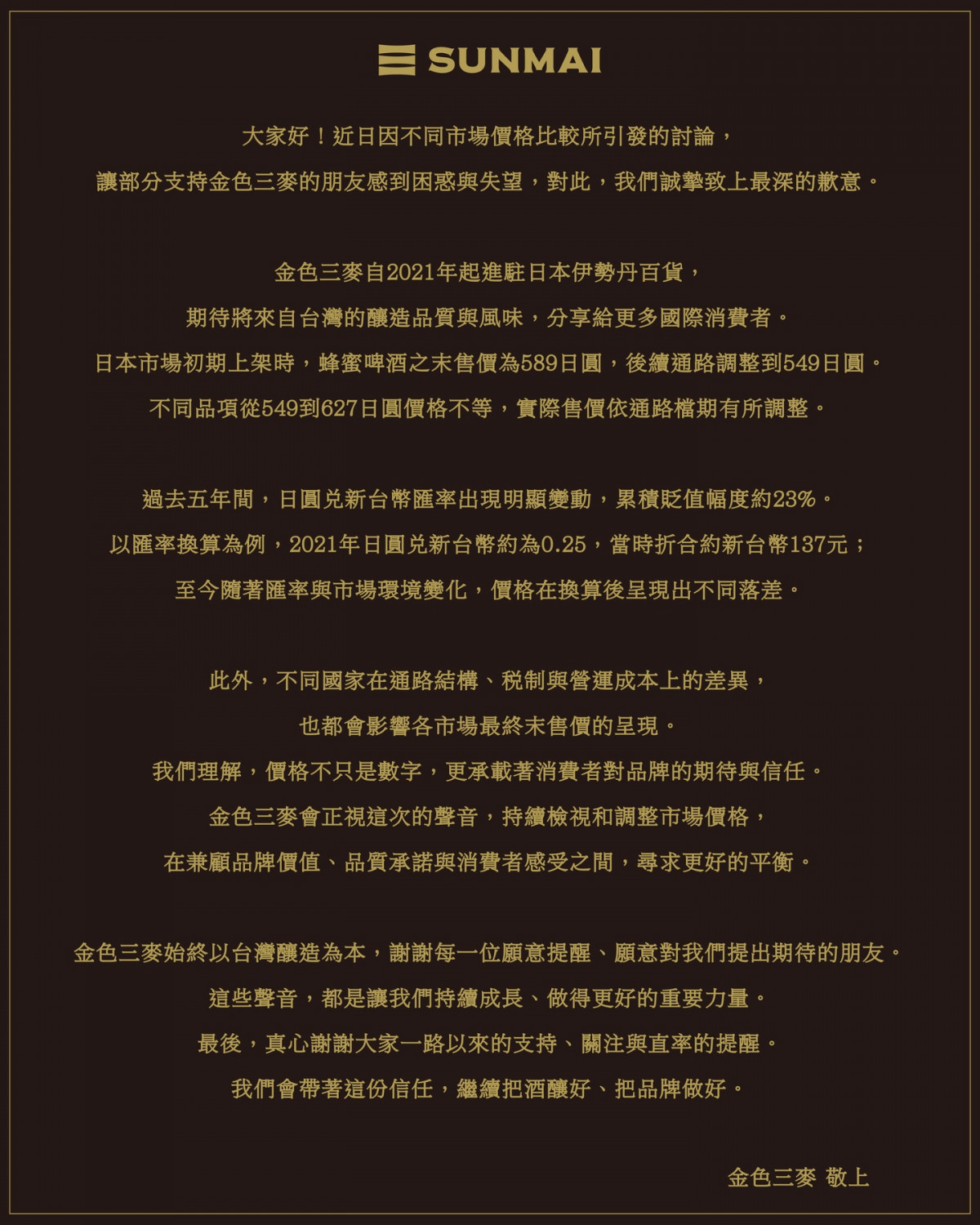 在通路結構、稅制及營運成本的差異等等,也皆影響市場最終價格的呈現。金色三麥強調,會正視此次的聲音,持續檢視和調整市場價格,在兼顧品牌價值、品牌承諾與消費者感受之間,尋求更好的平衡。