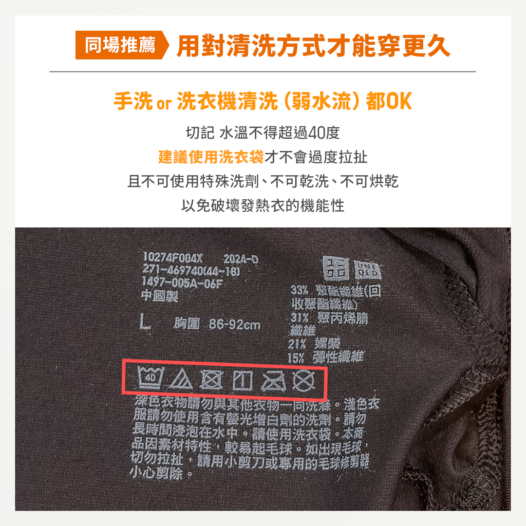 UNIQLO也分享發熱衣的正確清洗與保養方式,不論是手洗或機洗,只要用對方法,就能延長使用壽命、維持保暖機能。