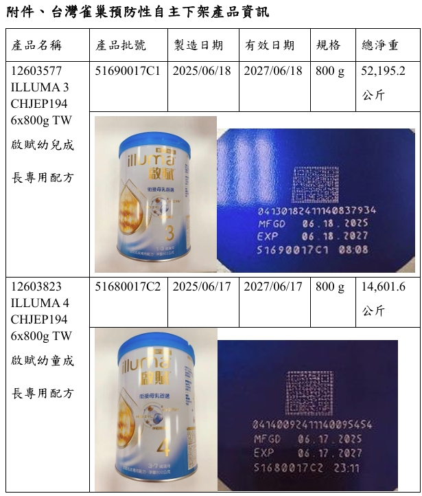 台灣業者預防性下架2批號「啟賦幼兒(童)成長專用配方」