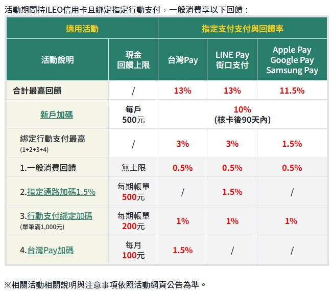 💡 iLEO信用卡:綁定Apple Pay、Google Pay、Samsung Pay享最高11.5%回饋