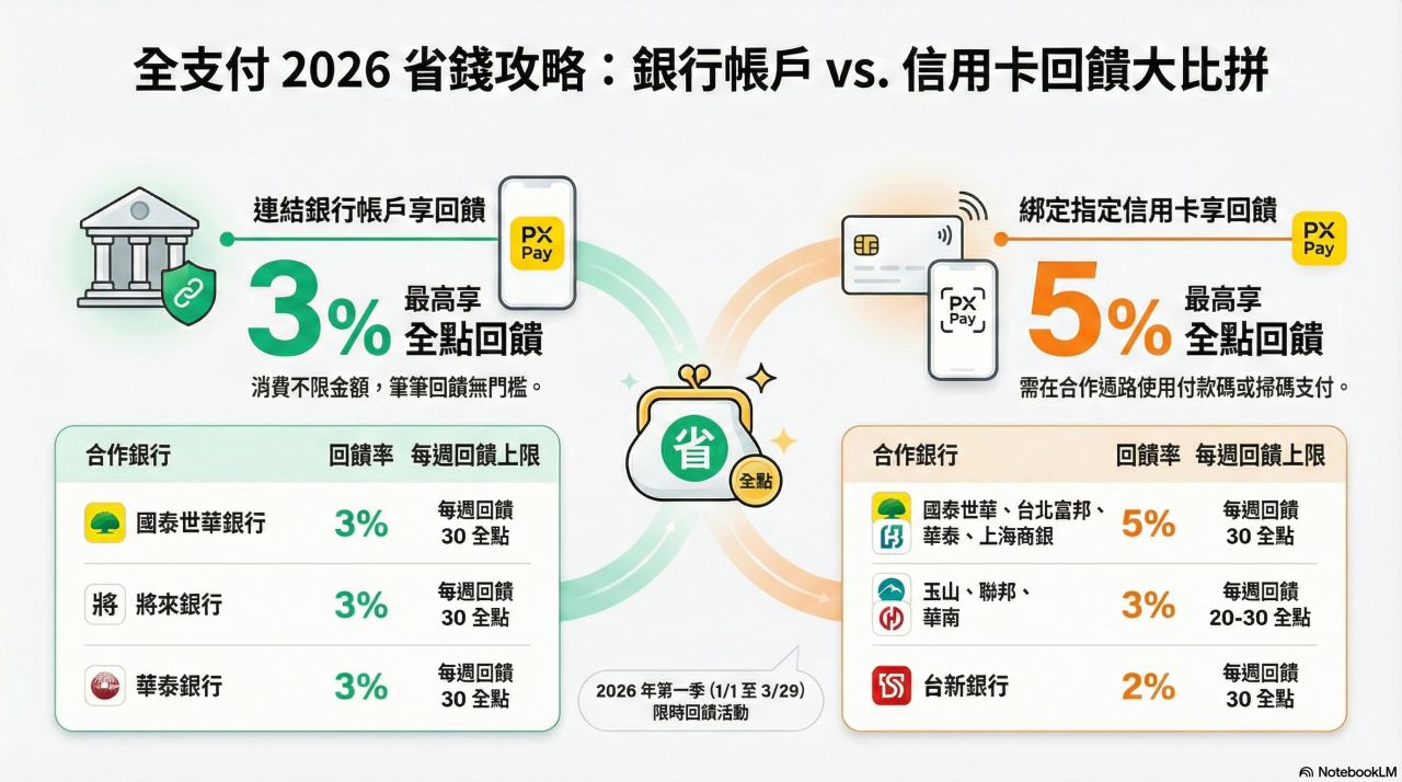 ▲全支付綁定指定銀行帳戶及信用卡,享3%~5%回饋。(圖/NotebookLM生成)