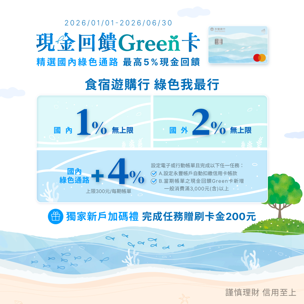 💡 永豐現金回饋Green卡:新戶綁定Apple Pay、Google Pay、Samsung pay、icash pay等行動支付,連續消費3個月(不限金額),享10%刷卡金回饋。