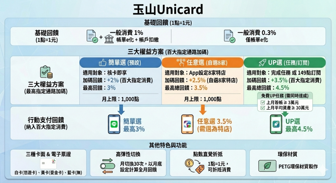💡 玉山Unicard:行動支付通路(玉山Wallet電子支付、LINE Pay、全支付、街口支付、悠遊付、全盈+PAY、iPASS MONEY、icash Pay)最高享3%回饋
