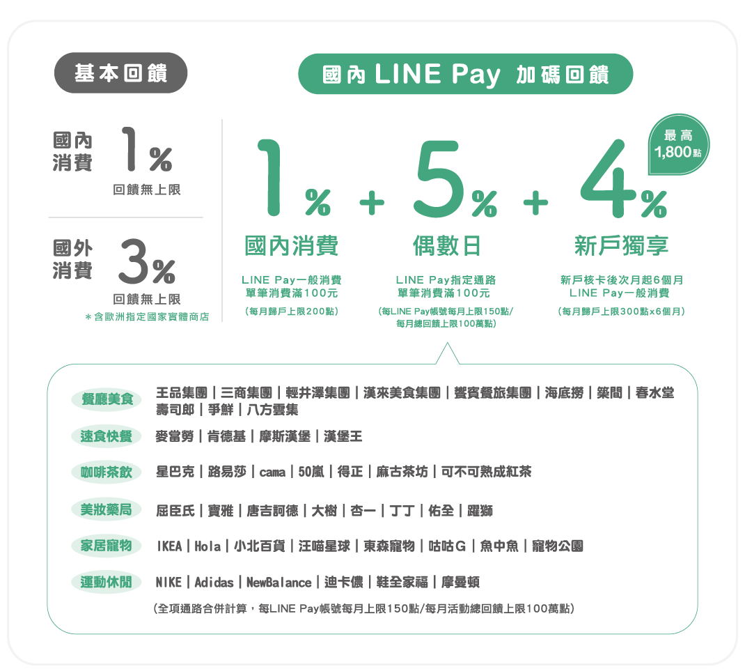 💡 台新街口聯名卡(台新街口豬富卡):新戶綁定LINE Pay、街口支付、icash Pay,全年消費加碼10%回饋