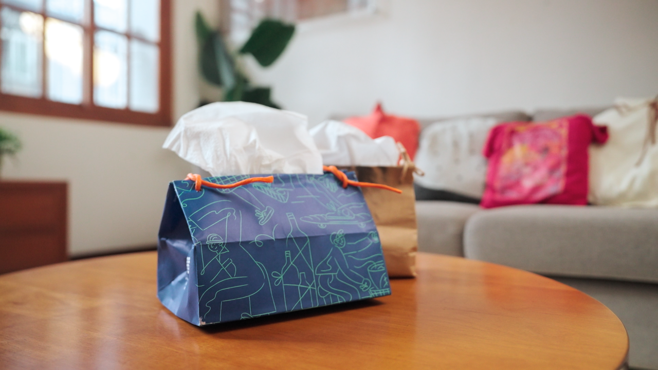 網購與購物的紙袋往往材質精良。湘陵建議,別急著回收!根據家中的衛生紙大小,進行簡單的剪裁與摺疊,短短5分鐘,一個帶有品牌設計感且獨一無二的「訂製紙巾盒」就此誕生。透過這樣的巧思,原本平凡無奇的衛生紙,瞬間提升視覺美感,也讓紙袋從一次性包裝,變成居家點綴。