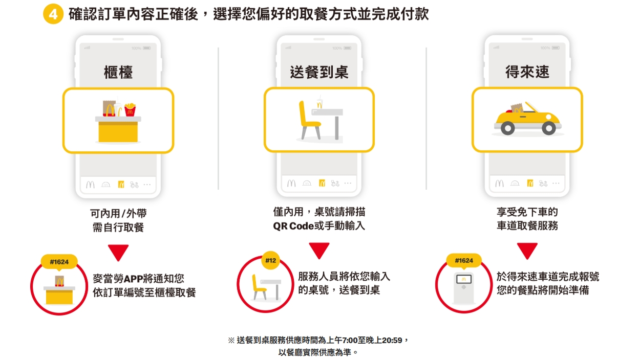 需注意的是,使用手機點餐「櫃檯」取餐服務請開啟麥當勞APP通知權限,並於通知後盡快取餐;使用麥當勞手機點餐「得來速」服務,請至得來速窗口報訂單編號完成點餐流程後,餐點方會開始製作;若超過兩小時未前來車道取餐,訂單將自動取消