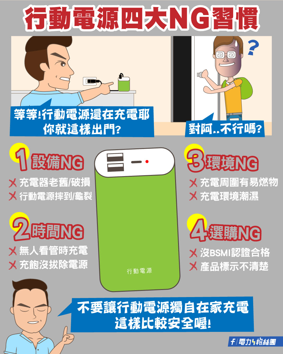 市面上的行動電源種類繁多,但原則上只要正確使用並避免NG行為,定期汰換不合適的行動電源,使用上都可以大幅降低自燃、爆炸的意外。建議在挑選行動電源時,一定要注意合格標籤認證,勿購買來路不明的行動電源,才能用得安心又放心。