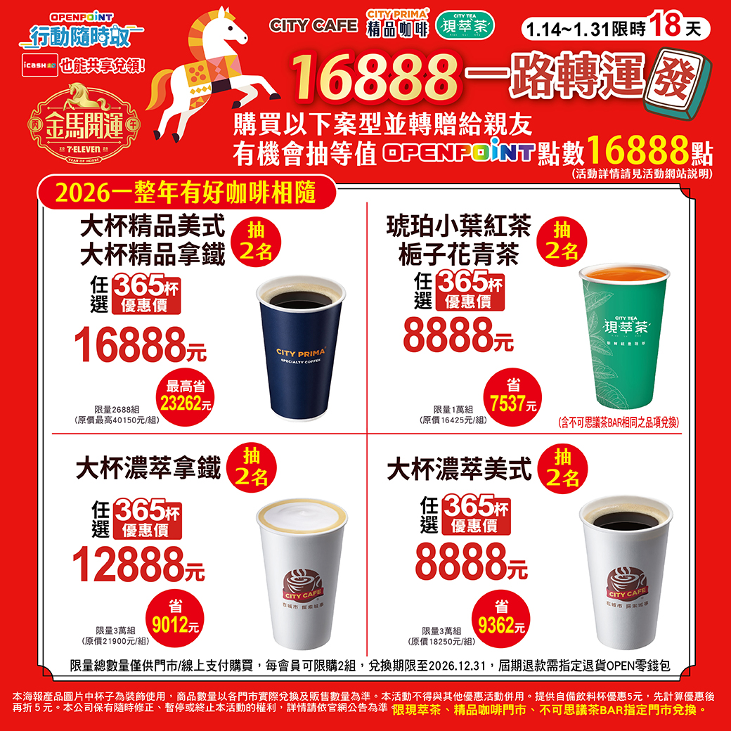 - 大杯精品美式、精品拿鐵365杯1萬6888元(原價110元、特價46元)
