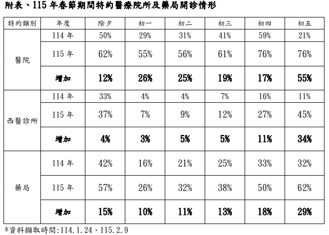 115年春節期間特約醫療院所及藥局開診情形。(圖/衛福部健保署)