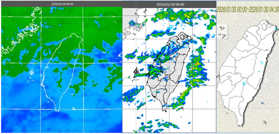 今(30日)晨4:30紅外線色調強化雲圖顯示,臺灣上空有有鬆散中層雲(左圖)。4:40雷達回波合成圖顯示,伴隨弱降水回波(中圖)。4:30累積雨量顯示,山區及東半部零星飄雨(右圖)。圖/氣象應用推廣基金會專欄