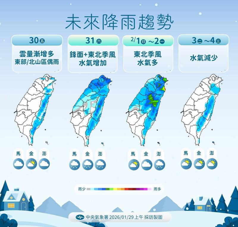 鋒面影響,週六(1/31)開始降溫下雨,苗栗以北從清晨到上午就會逐漸有降雨,宜蘭、花蓮則是上午到中午會逐漸轉為有雨的天氣,中部地區與台東中午過後到下午也會陸續開始下起雨來,南部地區則是傍晚或入夜後才有局部短暫降雨。
