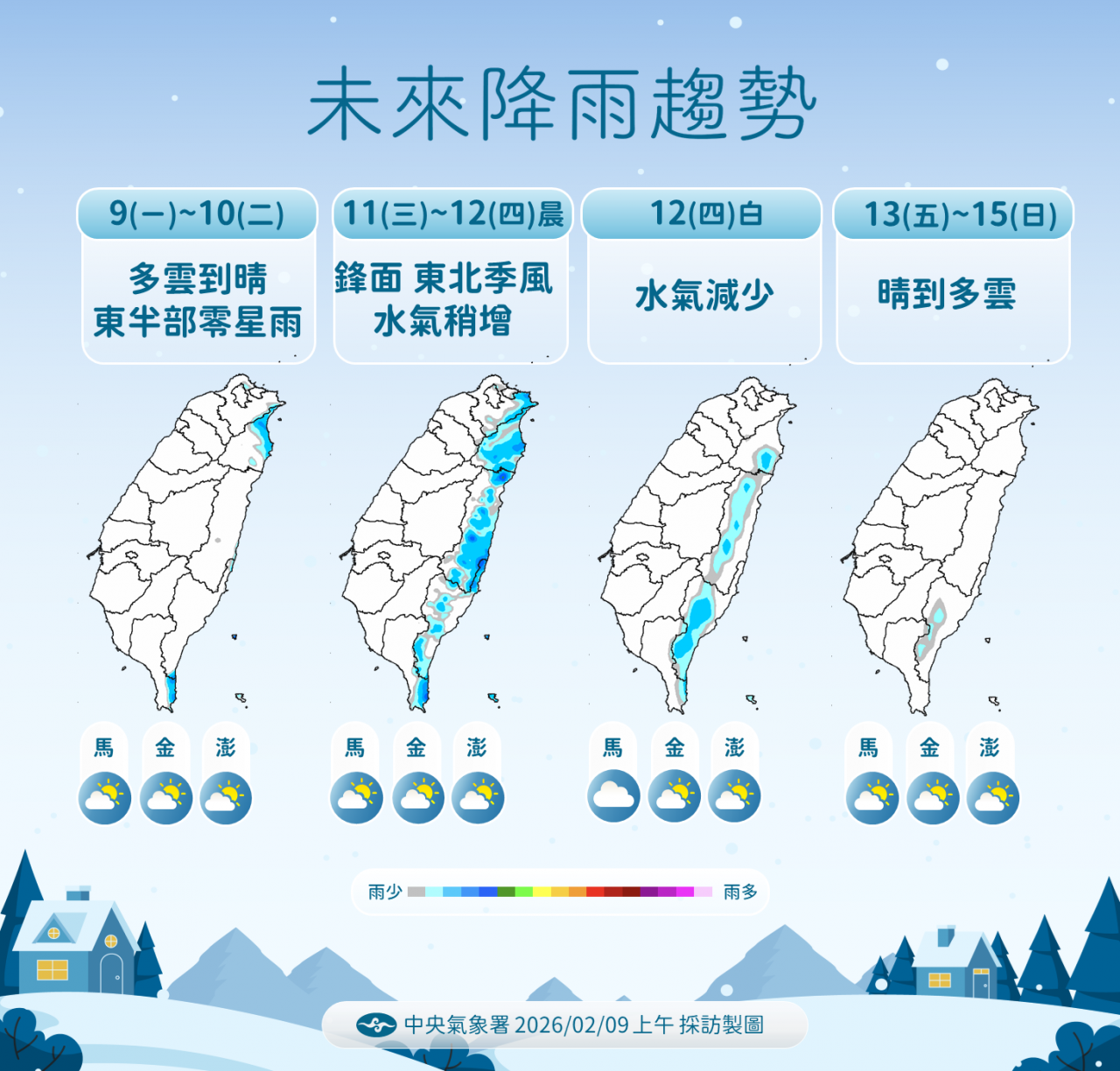 吳德榮說,週二(2/10)白天起至週三(2/11)上午冷空氣減弱,各地晴朗、白天氣溫升,因輻射冷卻,週三清晨仍有低溫。週三下午起另一小股冷空氣挾少量水氣南下,北部雲量增、北海岸、東半部轉有局部短暫雨,氣溫略降。週四(2/12)各地好轉為晴時多雲,氣溫回升,東半部偶有局部短暫雨的機率。週五至「小年夜」(2/13至2/15)各地晴朗穩定、回暖如春,因輻射冷卻,應注意日夜溫差很大。