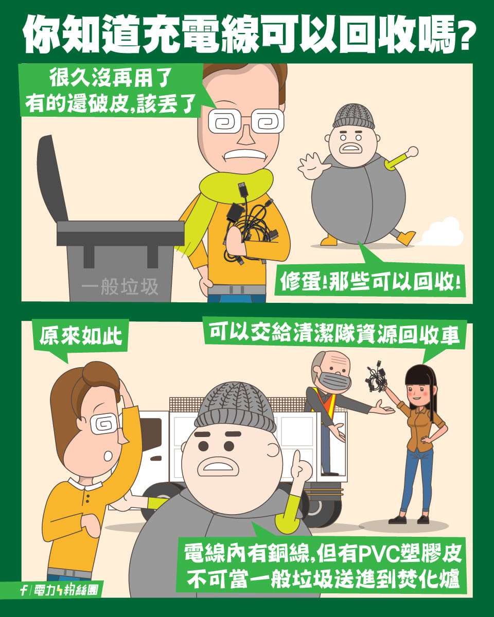 既然行動電源可以回收,那充電線、充電頭(豆腐頭)可以回收嗎?答案是可以。不少人每年手機換新機就會多一條充電線,閒置的舊充電線就可以拿去回收。台電電力粉絲團就曾發文提醒民眾,像是充電線、延長線、電源線、電線等內含銅線的電線,是可以交由清潔隊資源回收車進行回收的。