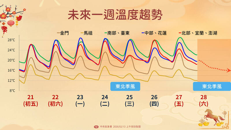 2/26~2/27:低溫預測:中部以北及宜蘭17~20度,南部、花東及澎湖20~22度,金門15~17度,馬祖12~13度;高溫預測:北部及東北部25~28度、中南部29~30度,花東25~28度,澎湖24~25度,金門21~23度,馬祖16度。