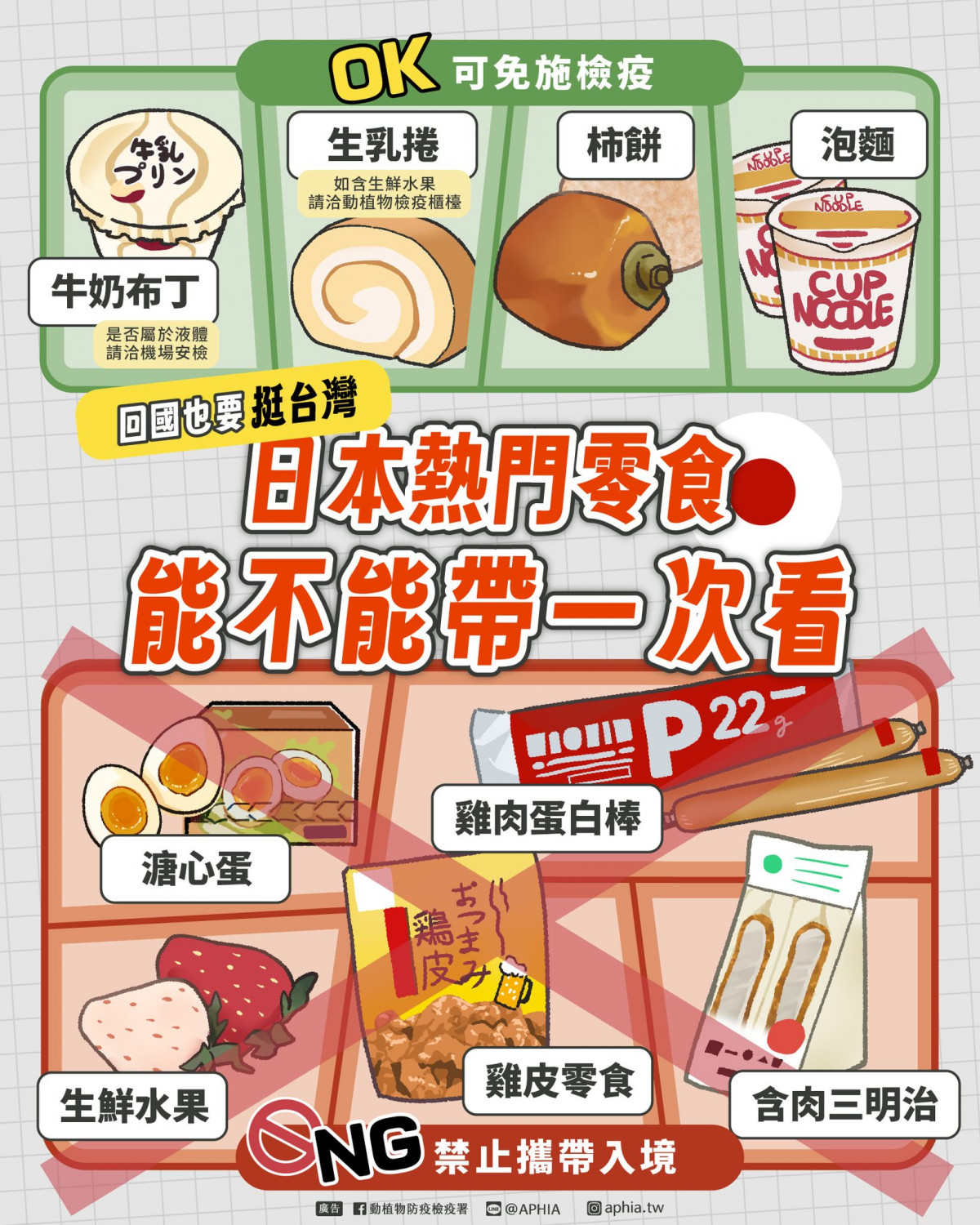 防檢署指出,部分日本熱門甜點其實可以攜帶入境,例如牛奶布丁與生乳捲屬於加工乳製品,原則上可帶回台灣;但若蛋糕上裝飾有生鮮水果,則需向動植物檢疫櫃檯確認。另外像柿餅屬於水果乾類,也可以攜帶入境。