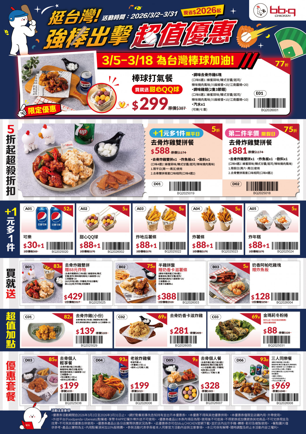 韓式炸雞品牌bb.q CHICKEN推出「挺台灣!強棒出擊」超值優惠,即日起至3月31日,限時推出「棒球打氣餐」,再推出平日限定「去骨雙拼 +1元多1件」、炸地瓜薯條買一送一等,不論內用或外帶出示優惠券圖示即可享優惠!