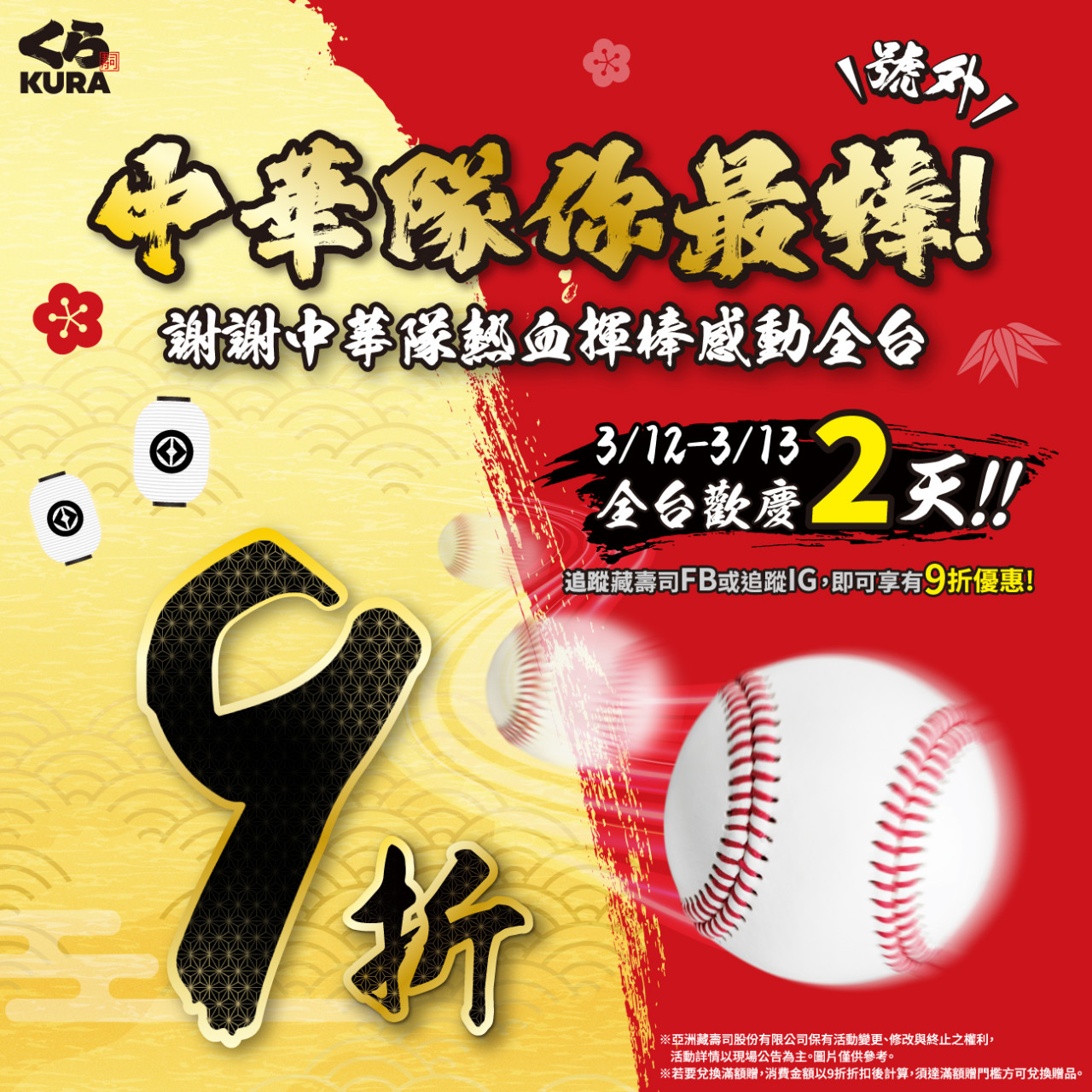 為感謝台灣隊打出動人的戰役,凡於3/12、3/13至全台藏壽司門市用餐,於結帳時出示「追蹤藏壽司FB或追蹤IG」的手機畫面,用餐不限金額享9折優惠。