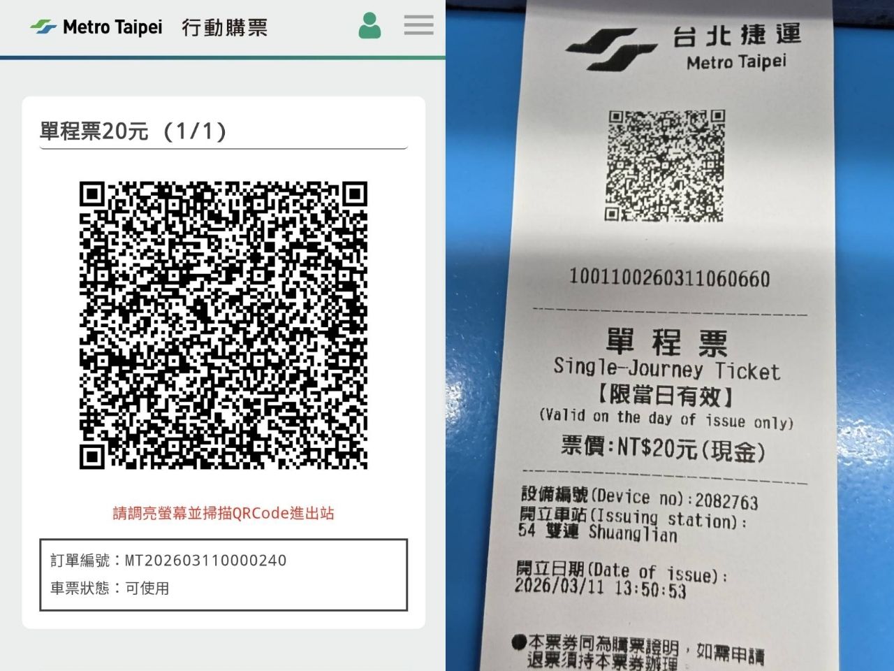 台北捷運提醒,「QR單程票」須於當日使用完畢,次日逾期無法使用;且進出站皆須使用同一組QR碼進出車站,若購買多張QR單程票,務必要多加留意。