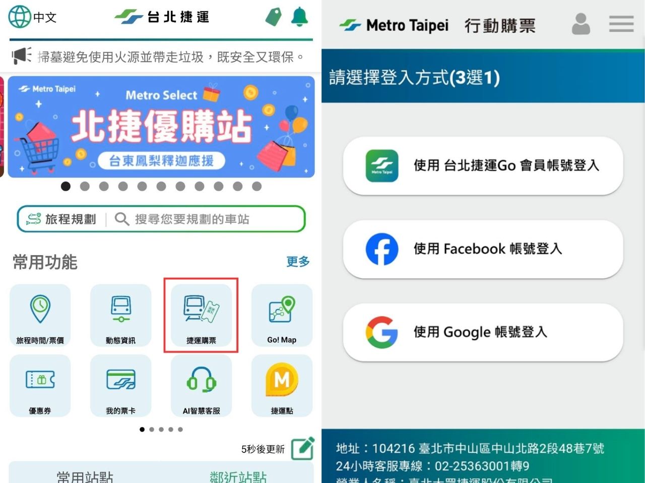 - 「台北捷運Go」App主頁→捷運購票→登入(台北捷運Go 會員帳號/Facebook帳號/Google帳號)
