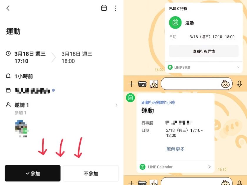 ▲建立行程後,可選擇參加/不參加(圖左),聊天室也會同步跳出「已建立通知」訊息(見圖右上);官方帳號將於活動前訊息通知提醒(見圖右下)。(圖/擷取自LINE APP)