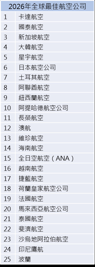 ▲2026年全球最佳航空公司25名榜單一次看。圖:新頭殼 林冠妤/製表