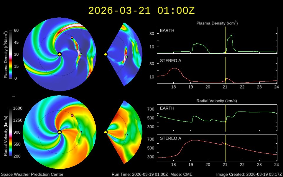 氣象署太空天氣作業辦公室進一步說明,受到太陽表面活躍區(AR4392)於周三(3/18)發生M2.3級太陽閃焰,並伴隨著顯著的日冕物質拋射事件(CME)。預估將在周六(3/21)通過近地太空環境,造成行星際空間中的太陽風風速及密度明顯增加。