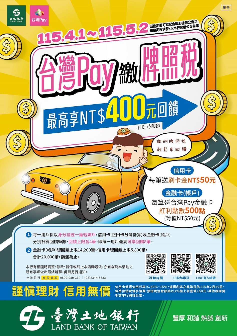 1、活動期間:2026/3/25~2026/4/30 (提醒:本活動期間非等同繳納期間,實際繳納期間請依使用牌照稅繳款書上繳納期間為主)